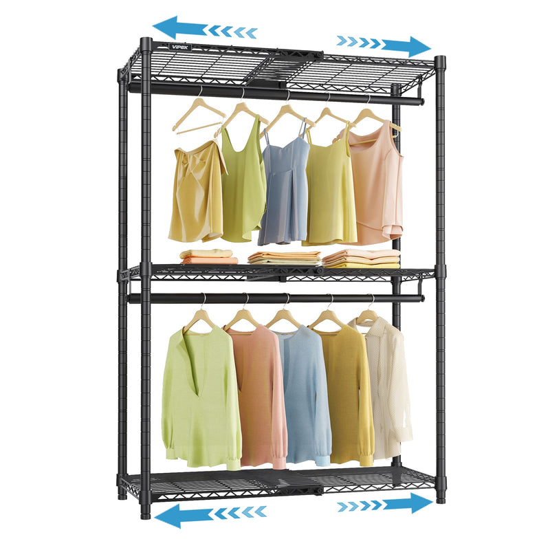 VIPEK X1 Expandable Clothes Rack is a versatile storage solution, adjustable from 2' to 3'5", featuring 3 expandable shelves and 2 extendable hanging rods. Ideal for small spaces, this heavy-duty rack supports up to 580 lbs, ensuring stability with its high-quality carbon steel construction. Perfect for bedrooms, dorms, and laundry rooms, it offers flexible organization for clothing and accessories while being easy to assemble with clear instructions.