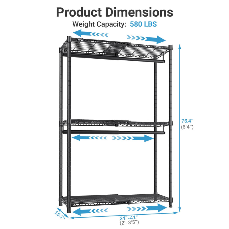 - Dimensions & Load Capacity: (24"-41")W x 15.8"D x 76.4"H, X1 clothing rack maximum load capacity 580 lbs, constructed of high-quality carbon steel, sturdy and reliable, it is long-lasting and features anti-tip devices to prevent unexpected falling.