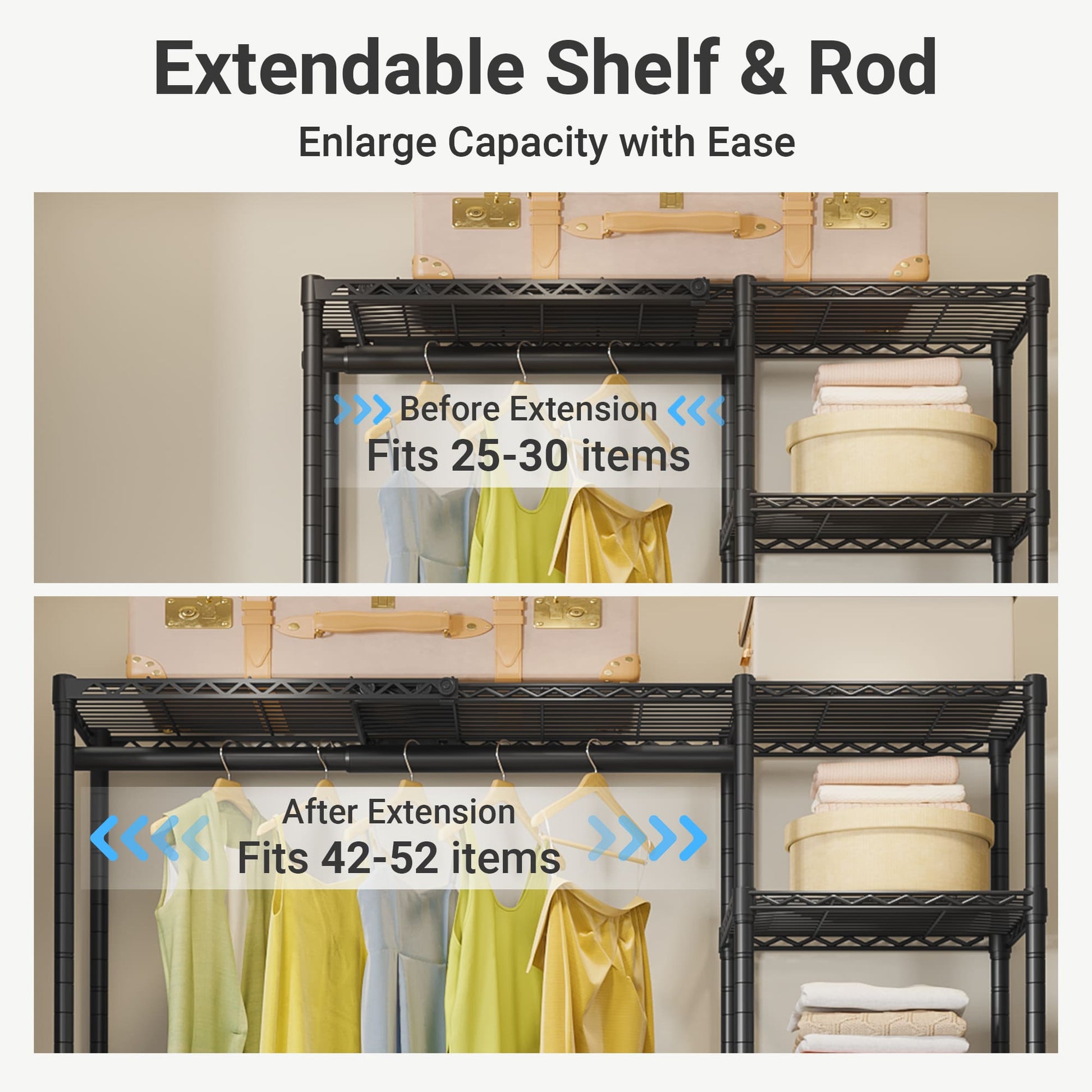 - Expandable Structural Design: With 2 extendable closet shelves and 2 extendable hanging rod, the VIPEK X2 freestanding closet rack adjustable from 3'3" to 4'8" width, the expansion of it has allowed you to get the most out of our space