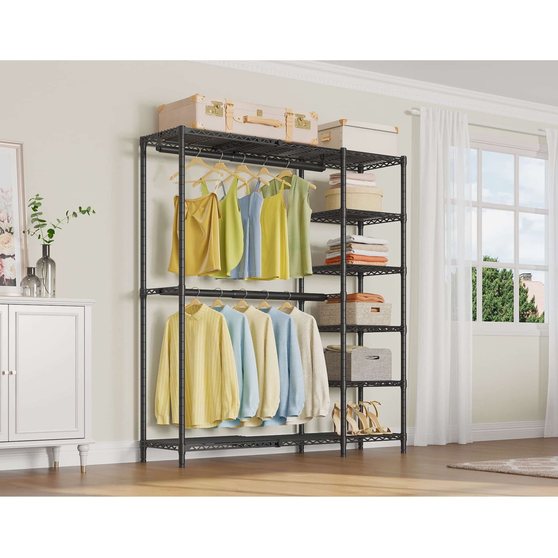 VIPEK X2 Expandable Clothes Rack features a smart structural design with 2 extendable closet shelves and 2 extendable hanging rods, adjustable from 3'3" to 4'8" in width, allowing you to maximize your available space efficiently. Built with stability in mind, it includes anti-tip devices for added safety. This multifunctional open closet rack provides ample storage for clothes, accessories, bedding, shoes, and more, with extra space on the upper shelves for convenient organization.